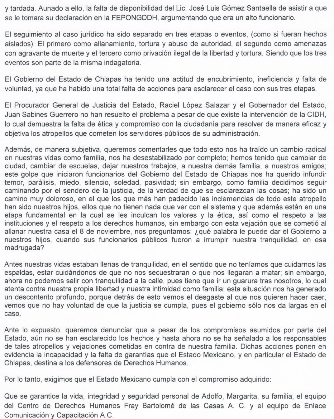 Ante lo expuesto, queremos denunciar que a pesar de los compromisos asumidos por parte del Estado, aún no se han esclarecido los hechos y hasta ahora no se ha señalado a los responsables de tales atropellos y vejaciones cometidas en contra de nuestra familia. Dichas acciones ponen en evidencia la incapacidad y la falta de garantías que el Estado Mexicano, y en particular el Estado de Chiapas, destina a los defensores de Derechos Humanos.